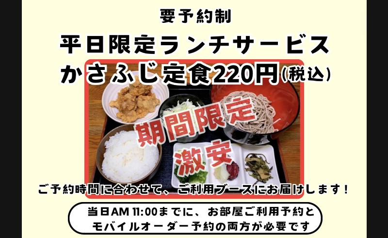 ご利用には、当日11:00までに、ブースご利用予約とランチ予約の両方が必要です。