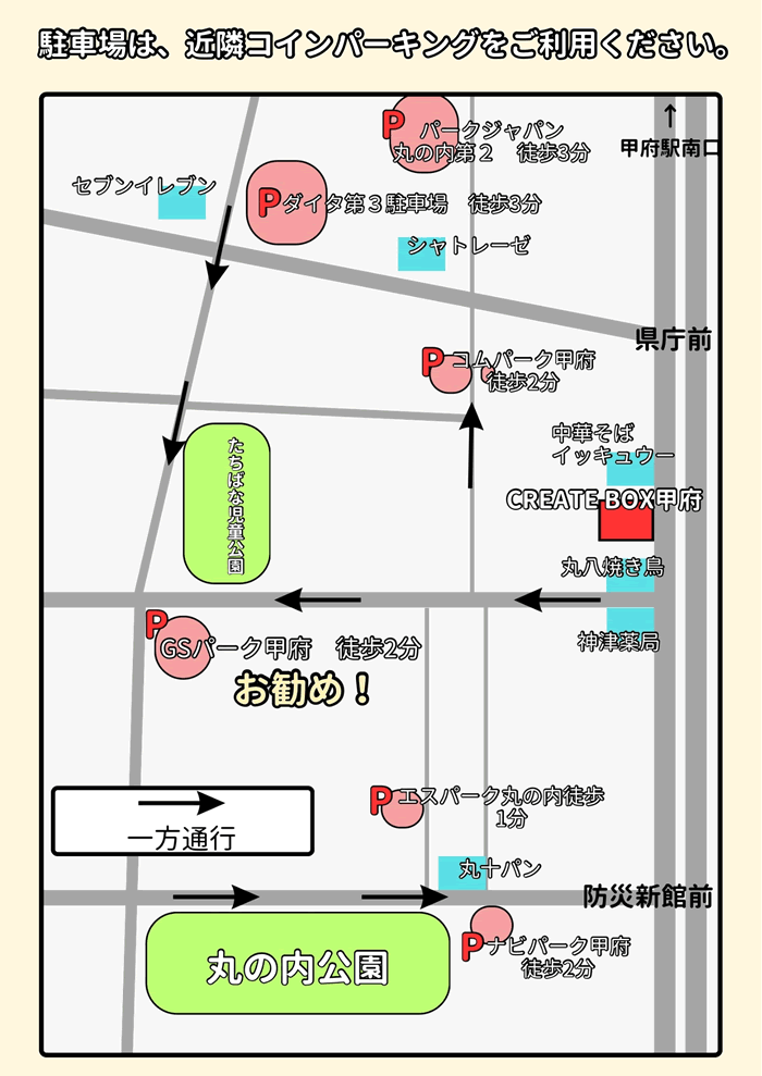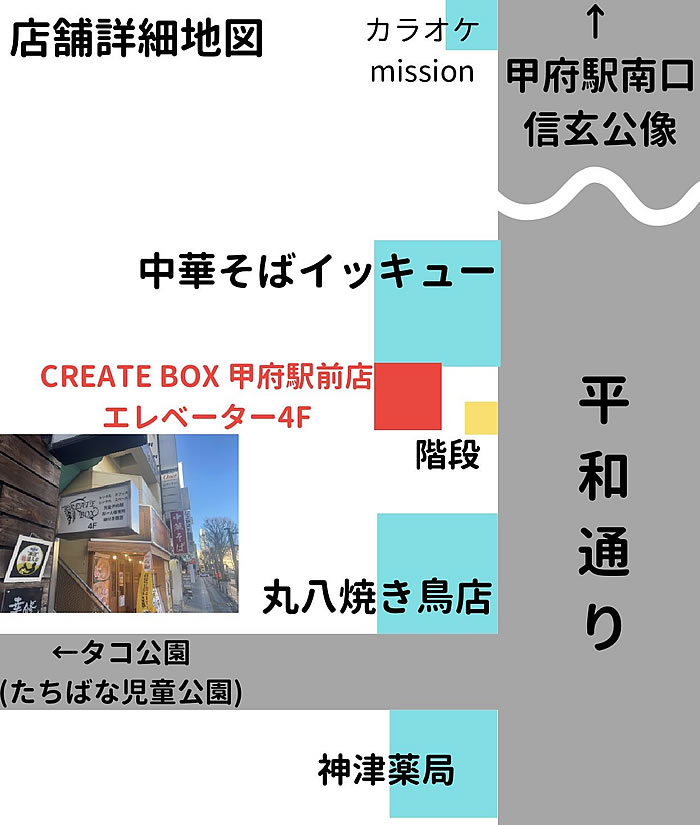 【甲府駅南口を出て、信玄公前を通り平和通りを南下「中華そばイッキュー」脇にあるエレベーターで4Fに上がってください。】